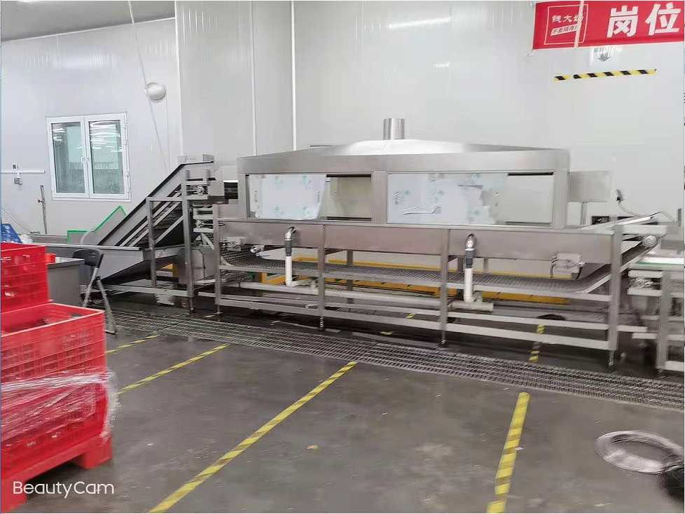 客戶的工藝是從傳送帶上清洗,蔬菜,水果,肉類,包含,雞鴨魚,用臭氧水在清洗機去除水產的腥味達到消毒殺菌的作用